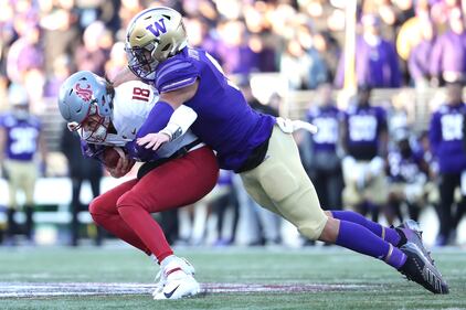 SEATTLE, WASHINGTON - NOVEMBER 29: Anthony Gordon #18 of the Washington State Cougars is sacked by Joe Tryon #9 of the Washington Huskies in the third quarter during their game at Husky Stadium on November 29, 2019 in Seattle, Washington. (Photo by Abbie Parr/Getty Images)