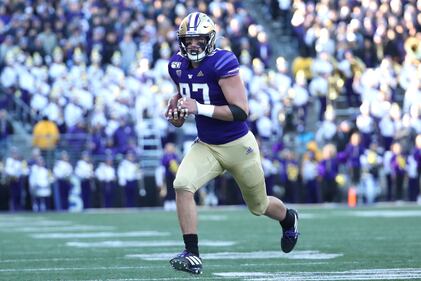 SEATTLE, WASHINGTON - NOVEMBER 29: Jacob Eason #10 of the Washington Huskies celebrates after running for a touchdown in the first quarter against the Washington State Cougars during their game at Husky Stadium on November 29, 2019 in Seattle, Washington. (Photo by Abbie Parr/Getty Images)