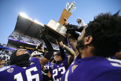 SEATTLE, WASHINGTON - NOVEMBER 29: The Washington Huskies celebrate with the Apple Cup trophy after defeating the Washington State Cougars 31-13 during their game at Husky Stadium on November 29, 2019 in Seattle, Washington. (Photo by Abbie Parr/Getty Images)