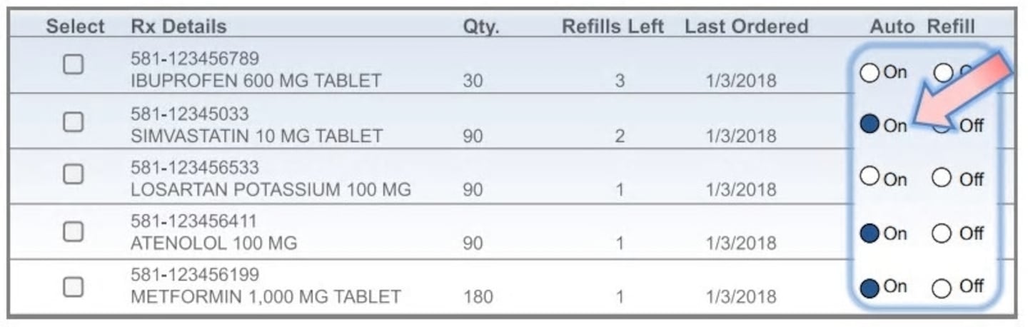 From there, you can set up individual prescriptions for Auto Refill by clicking the “on” (or “off”) button in the Auto Refill column.