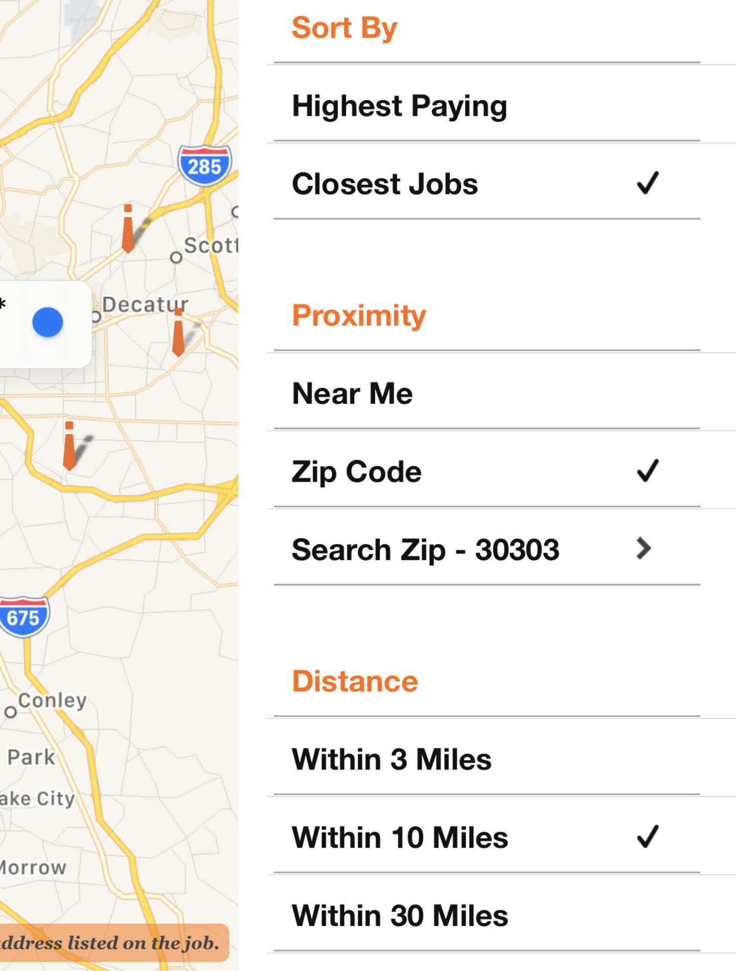 From there you can check the Closest Jobs option as well as the Near Me or Zip Code feature. You can also choose between 3 Miles, 10 Miles or 30 Miles.