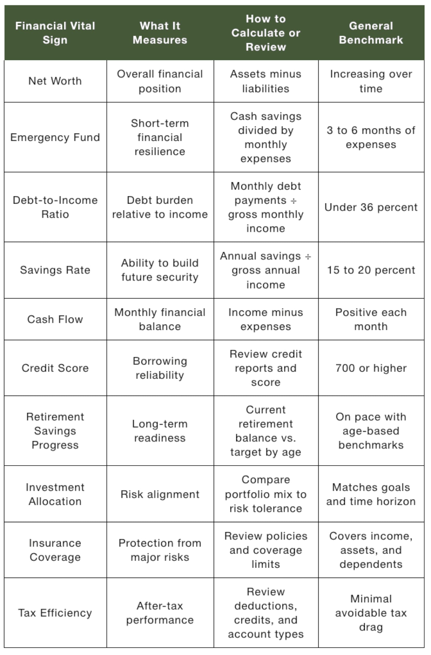 The most important financial vital sign on a day-to-day basis is your cash flow. Are you spending less than you’re bringing in? Are you saving at least some of your income? When you look at the big picture, your retirement savings progress, tax efficiency, and healthcare planning become especially relevant as retirement approaches. Reducing your debt and ensuring that your portfolio risk aligns with your financial goals can put you in the best position for retirement.