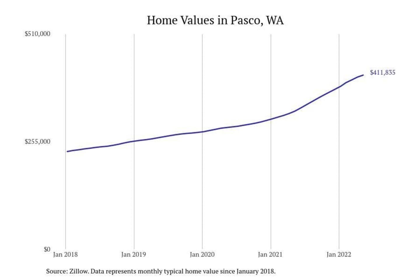 Stacker compiled a list of cities with the most expensive homes in the Kennewick metro area using data from Zillow. Charts show the monthly typical home value since January 2018. All 9 cities and towns with data available were included in the list.