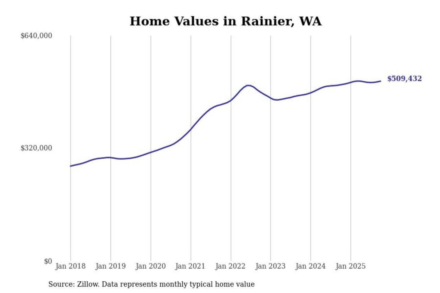 Stacker compiled a list of cities with the most expensive homes in the Olympia metro area using data from Zillow. Charts show the monthly typical home value since January 2018. All 8 cities and towns with data available were included in the list.