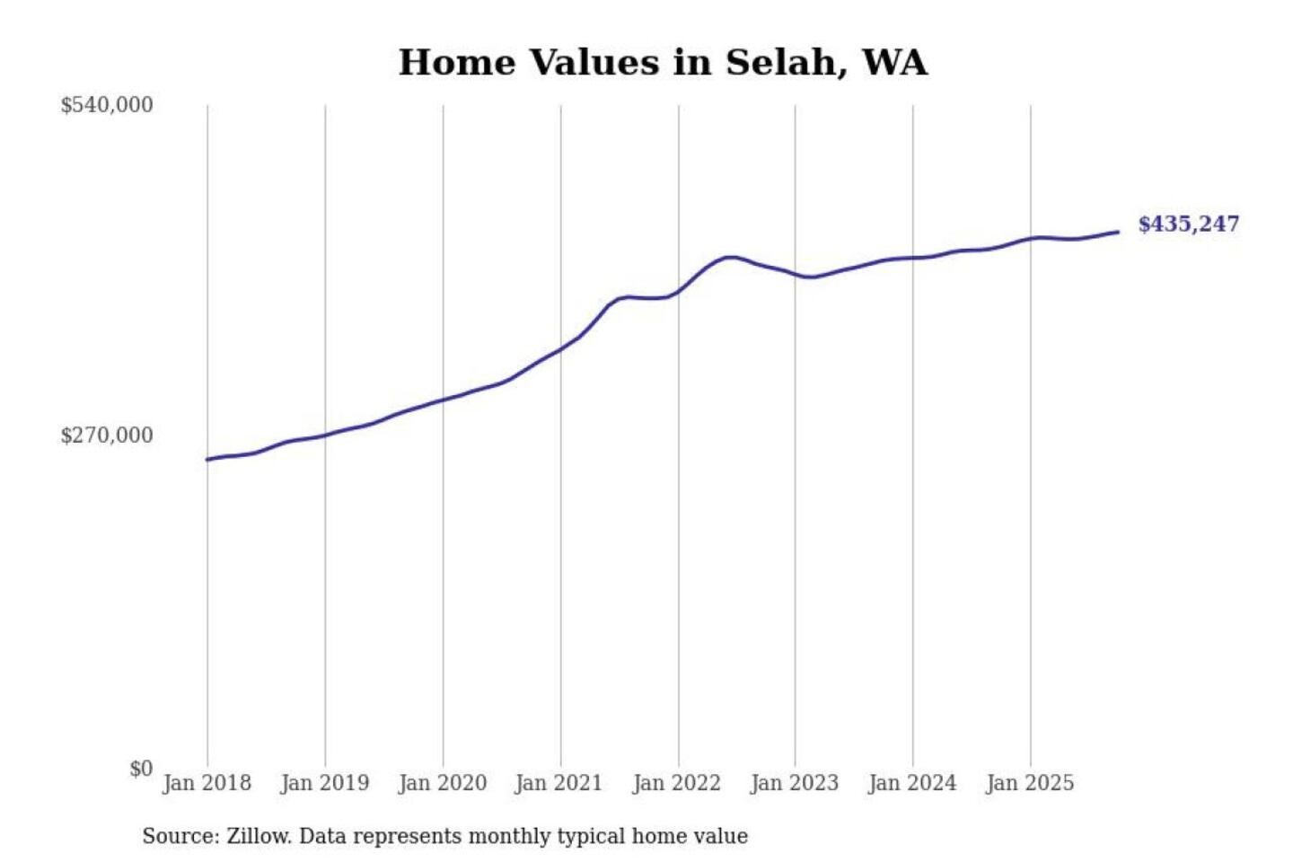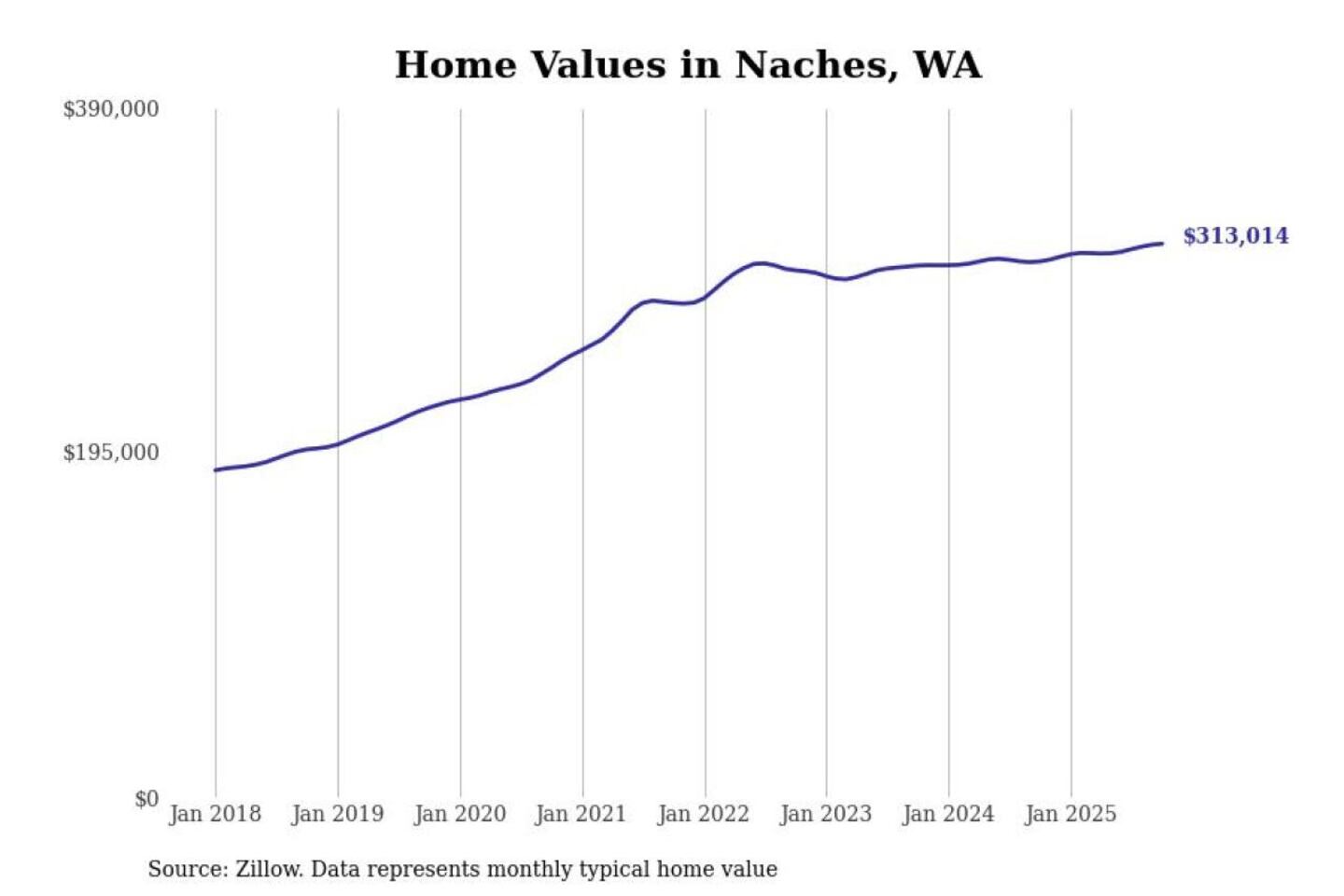 Stacker compiled a list of cities with the most expensive homes in the Yakima metro area using data from Zillow. Charts show the monthly typical home value since January 2018. All 18 cities and towns with data available were included in the list.
