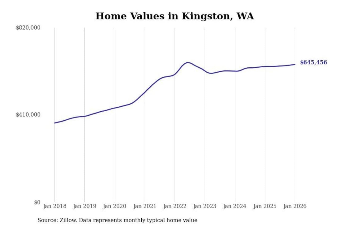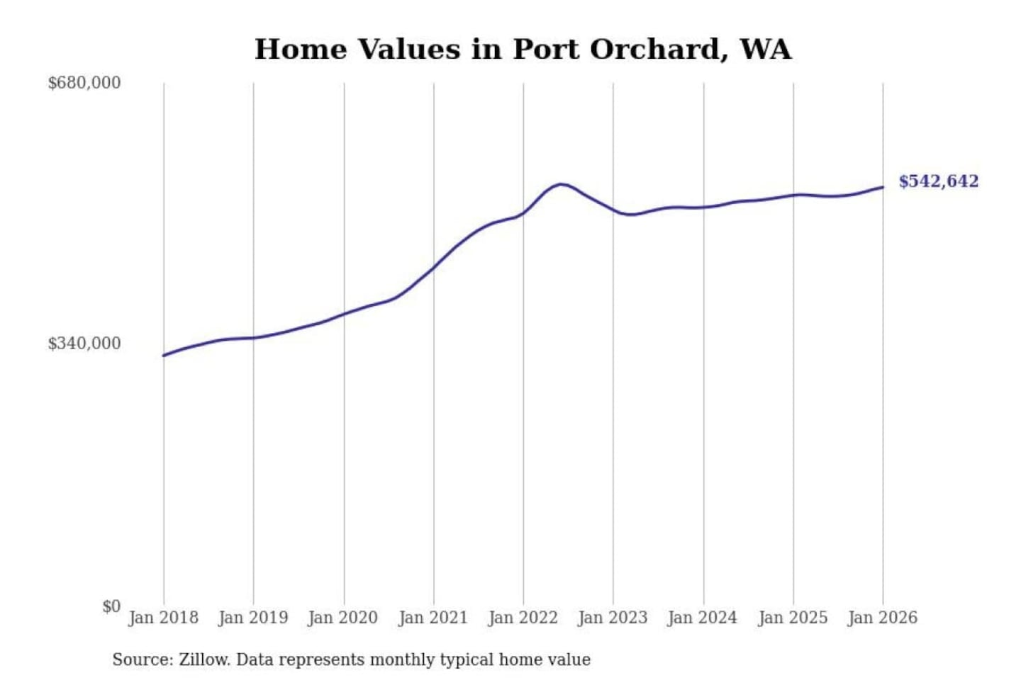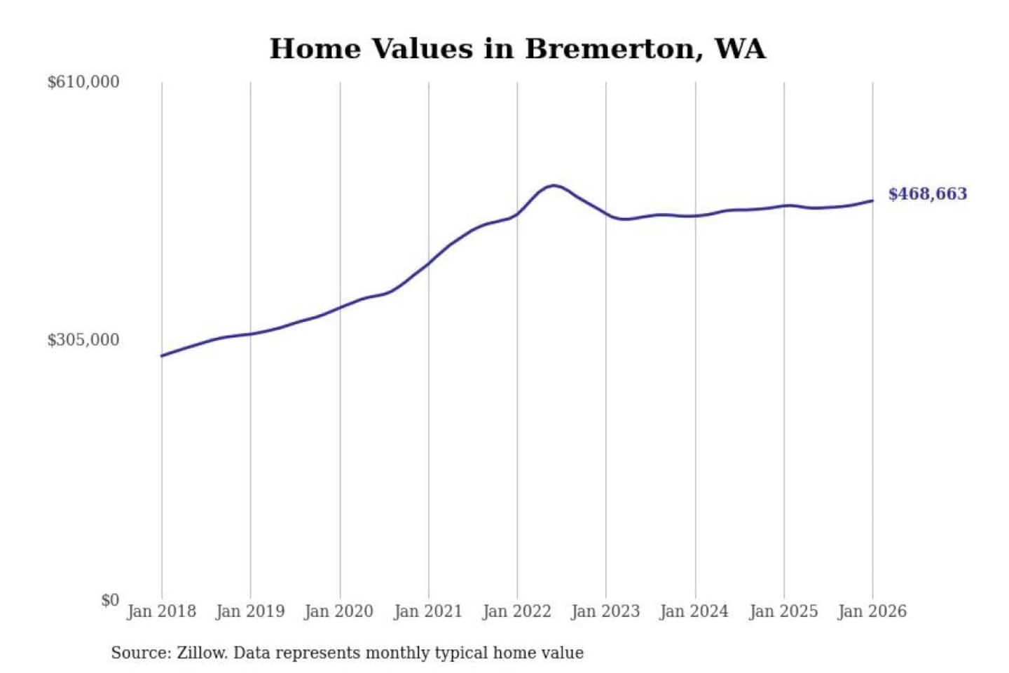 Stacker compiled a list of cities with the most expensive homes in the Bremerton metro area using data from Zillow. Charts show the monthly typical home value since January 2018. All 12 cities and towns with data available were included in the list.