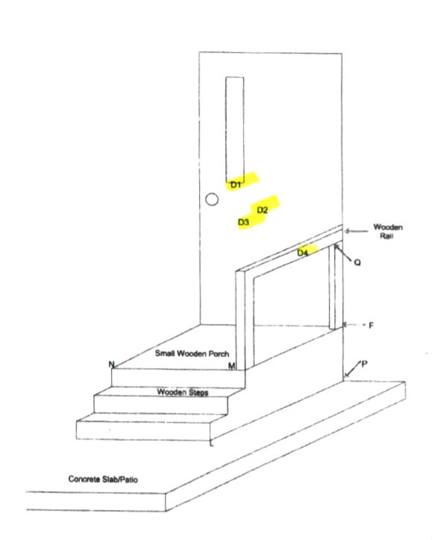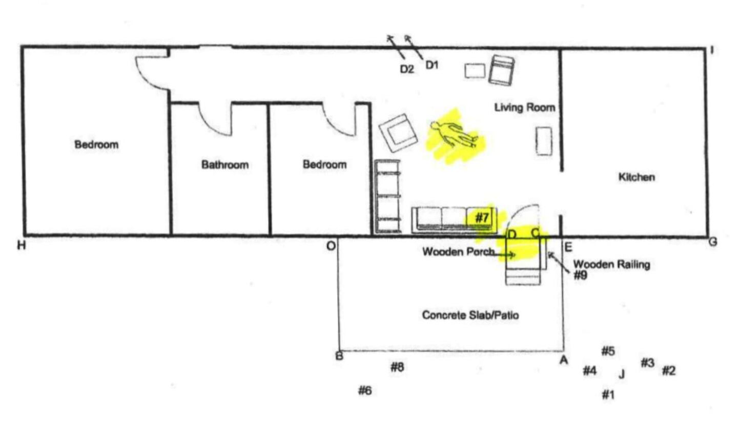 A second diagram in the report shows four “projectile defects” caused by the bullets fired from Durden’s gun. Three of them were in the door and the fourth was in a wooden railing on the mobile home’s small wooden porch.