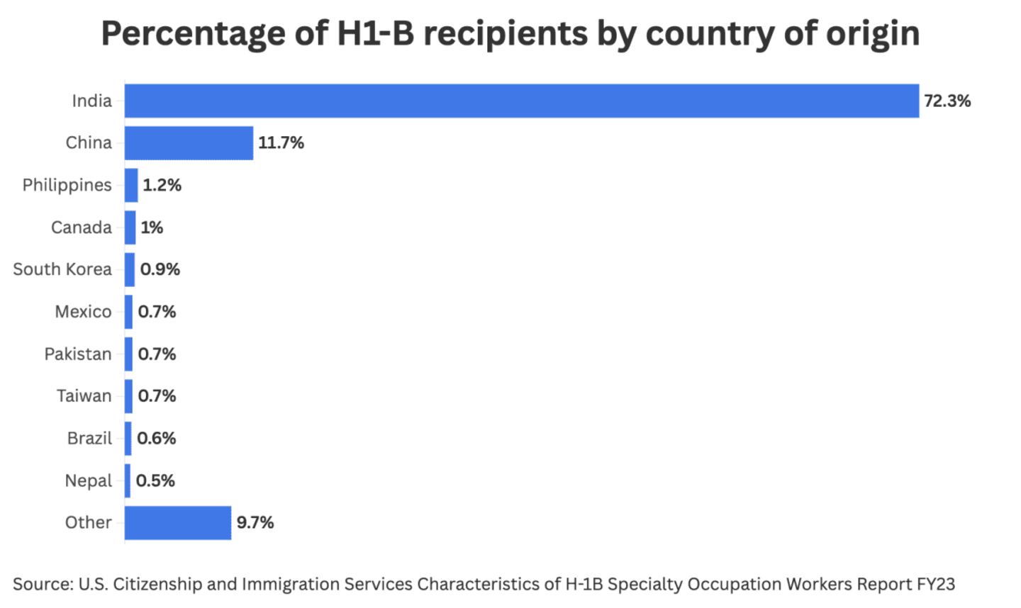 The typical H-1B recipient is 33, holds at least a bachelor's degree, and works in a tech-adjacent role. According to the latest congressional report from USCIS, 72.3% of approved H-1B petitions in FY 2023 came from India, followed by China at 11.7%. The rest came from countries like Canada, South Korea, and the Philippines in much smaller numbers.