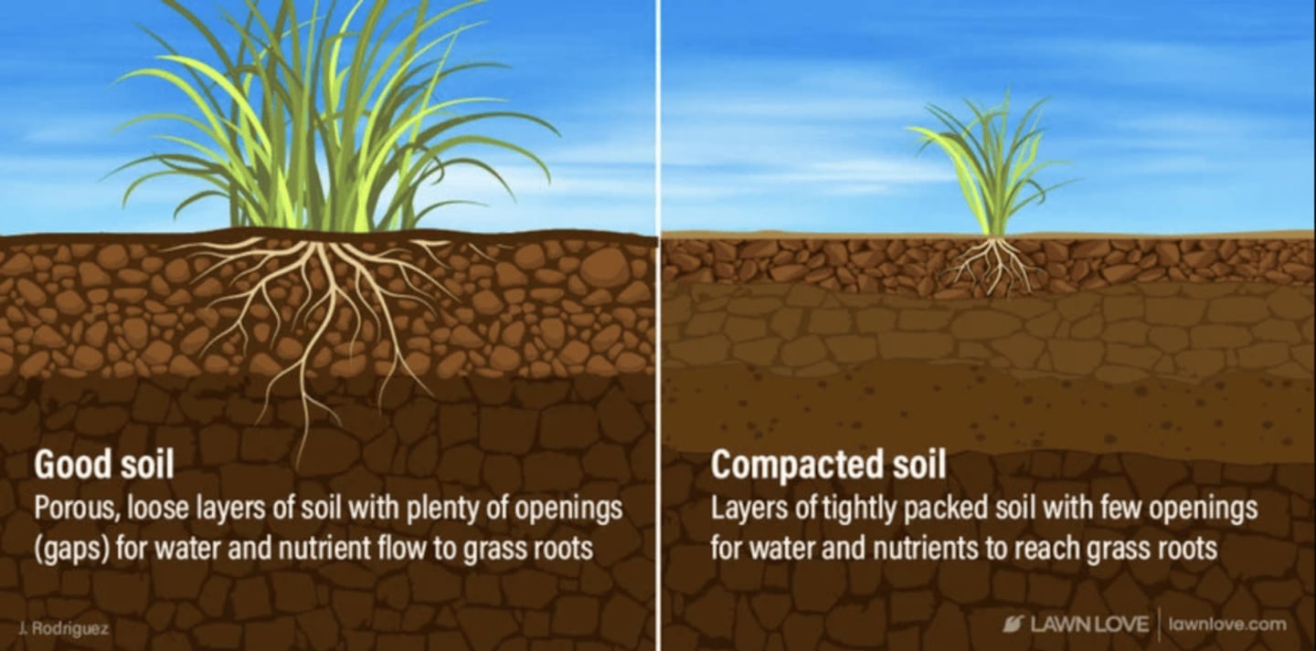 USDA research shows that compacted soil can reduce water infiltration by three to 30 times, depending on load and soil type. This means most water runs off instead of reaching the grass roots.