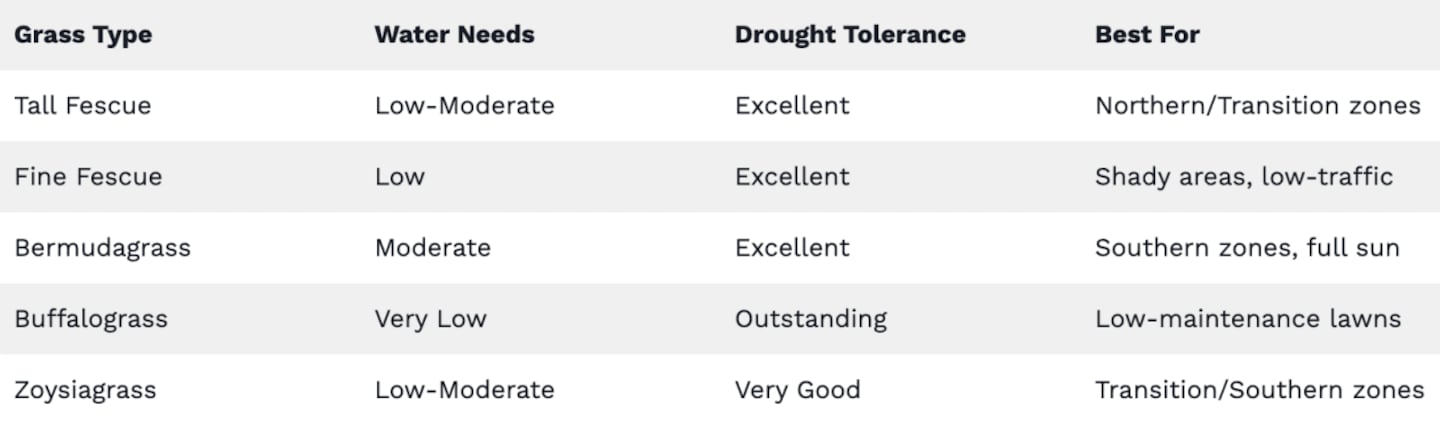 - Drought-tolerant grasses like tall fescue and Bermuda grass need significantly less water than traditional varieties.