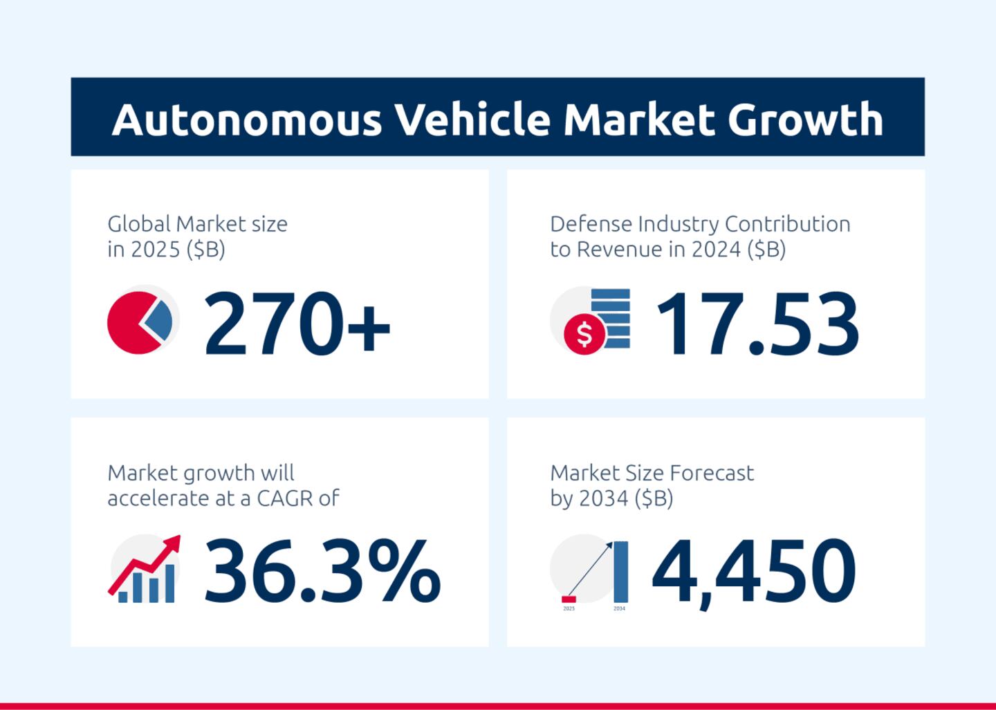 The global autonomous vehicle market is worth over $270 billion and is forecast to reach over $4,450 billion within the next decade. The defense industry contributed $17.53 billion in autonomous vehicle revenue during 2024 alone and has emerged as a leading source of demand for this technology.