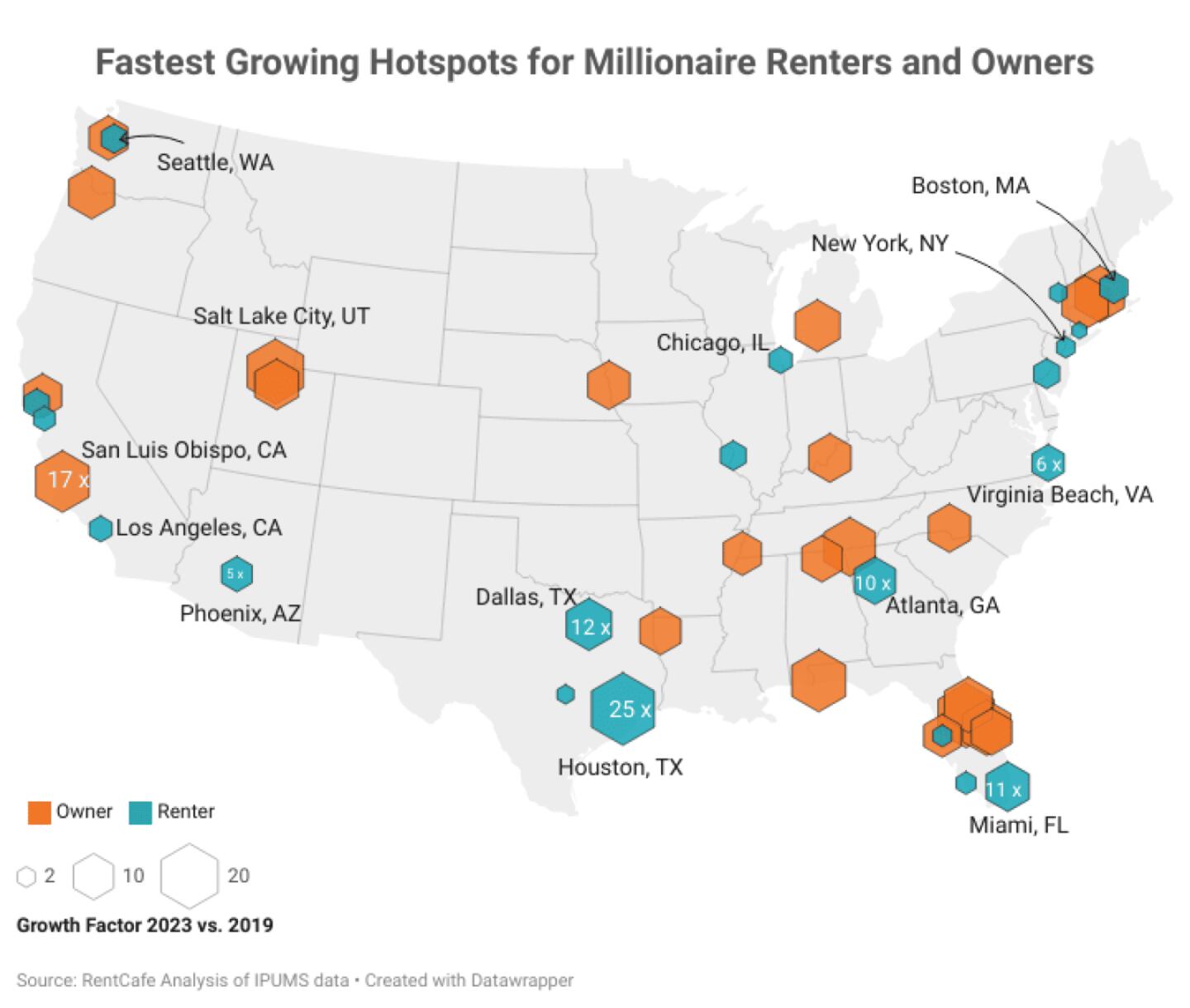 From 2019 to 2023, the number of millionaire renters in the U.S. tripled, outpacing the growth of wealthy homeowners. While places like New York and San Francisco still draw plenty of high-earning renters, new hotspots in Texas and Florida are showing that more of the country's wealthy are choosing to rent instead of buy.