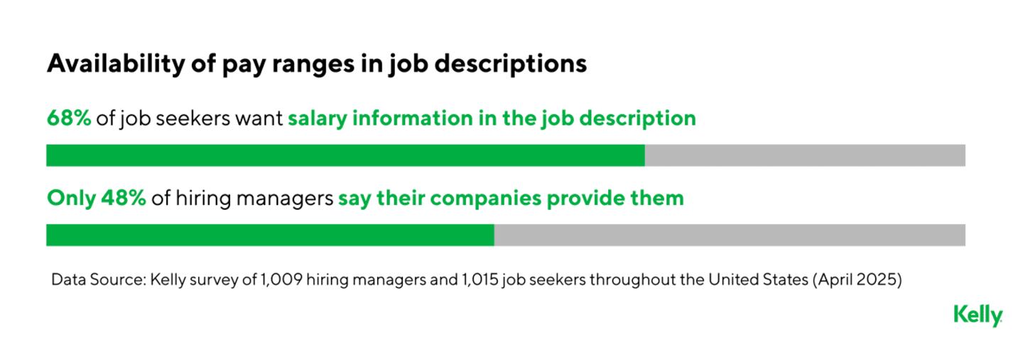 The survey shows salary disclosure continues to be a sticking point in hiring. Most job seekers, 68 percent, say they want salary information posted in job descriptions. Less than half of hiring managers, 48 percent, say their companies provide this information in the job description from the start.