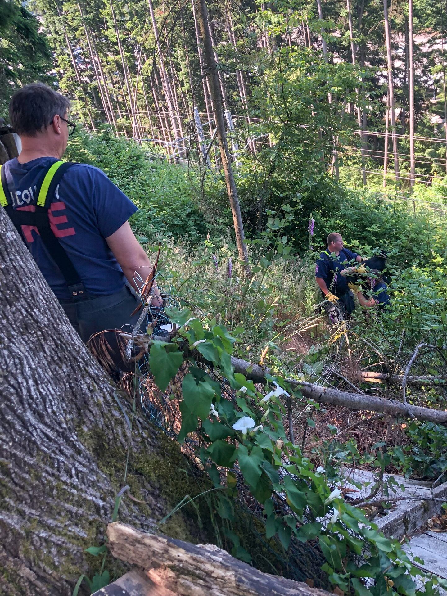 Crews were able to make their way through the thick brush and carried him up the hill.