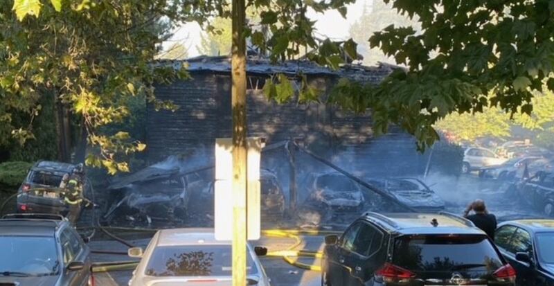 “By the time the fire department got here, fire … the car port was completely engulfed in flames. It was starting to fall forward and then it started catching on to the building behind us. Or behind it,” a woman named Amanda said.