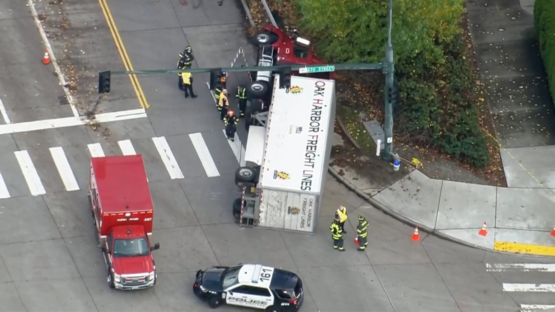 KIRKLAND, Wash. — A commercial truck rolled over onto its side in Kirkland on Friday, according to the Kirkland police.