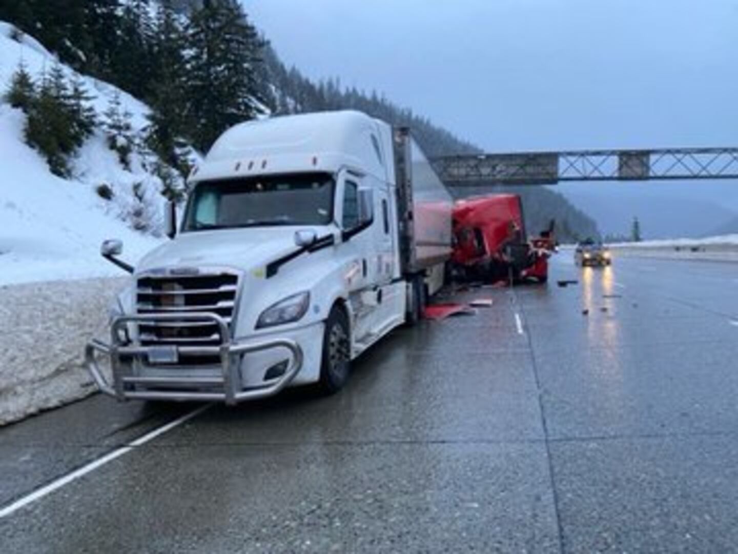 SNOQUALMIE PASS, Wash. — Two lanes going eastbound on I-90 over Snoqualmie Pass are blocked after a crash involving two semi-trucks.