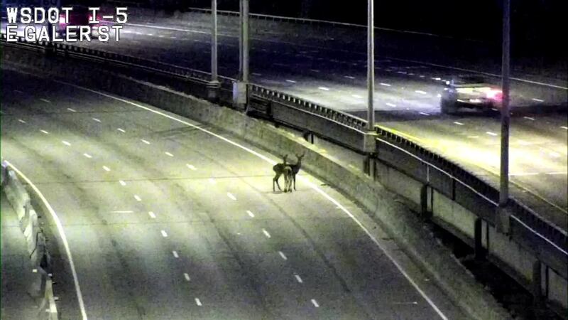SEATTLE — Two deer somehow made their way onto the Interstate 5 express lanes between Mercer Street and State Route 520, just north of downtown Seattle.