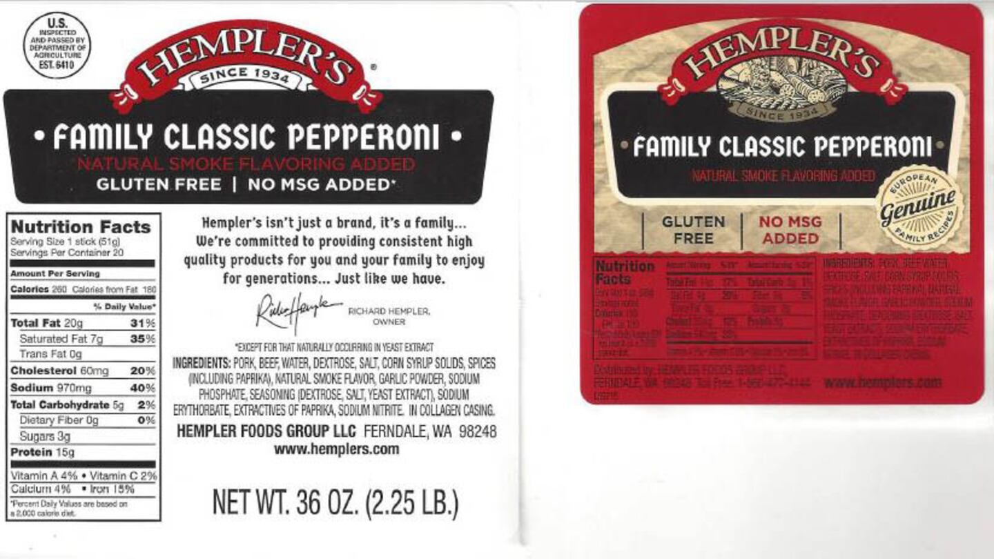 - 10 count/case of 9-oz. of "HEMPLER'S FAMILY CLASSIC PEPPERONI, NATURAL SMOKE FLAVORING ADDED" with "USE OR FREEZE BY" date 01/15/19 and "LOT # 8106."