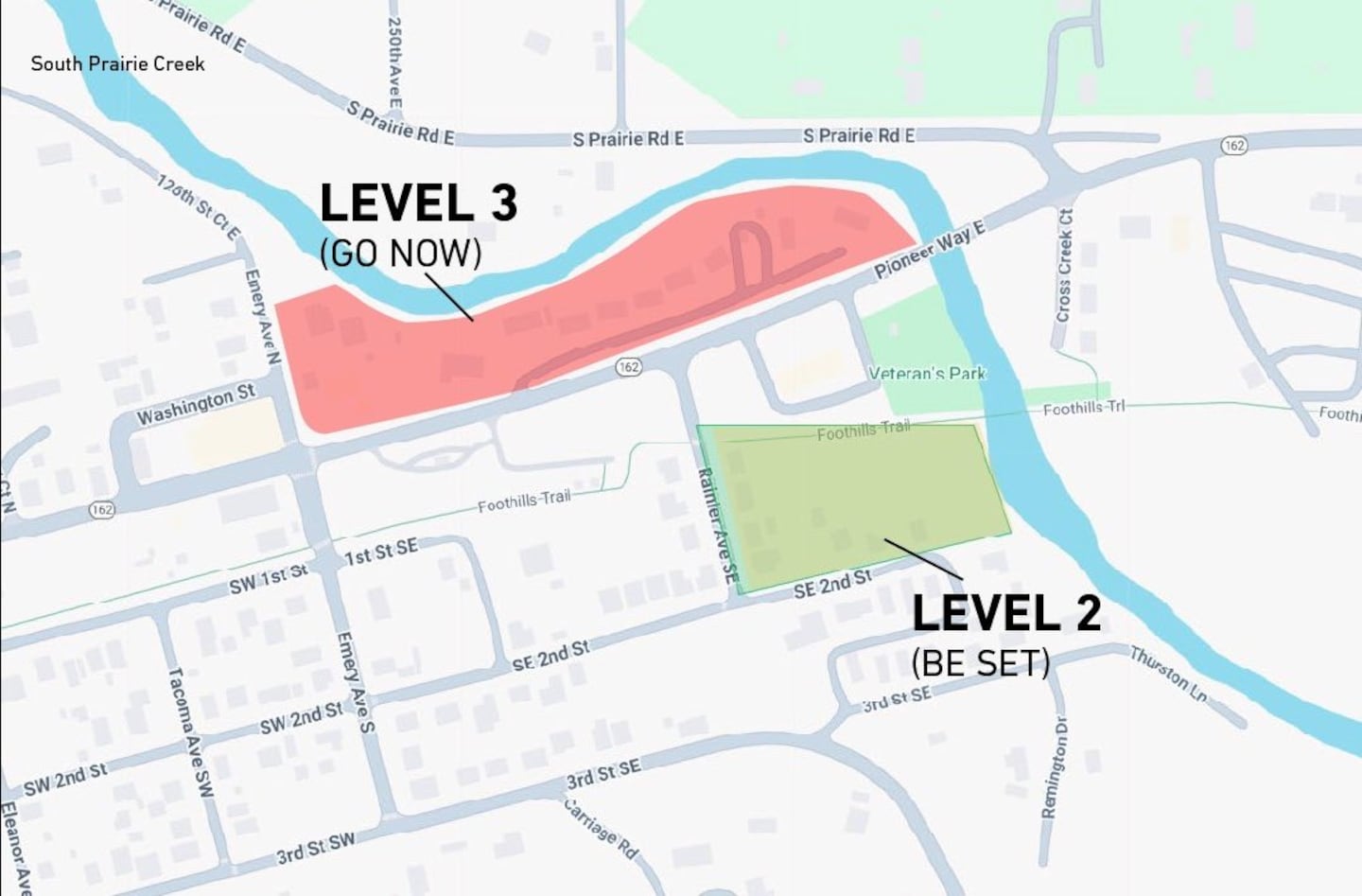 The Pierce County Sheriff’s Office has issued Level 3 Evacuations, which means go now, for homes between SR 162 and S. Prairie Rd. E, west to Emery Ave N. Deputies are going door-to-door to notify people in the area.