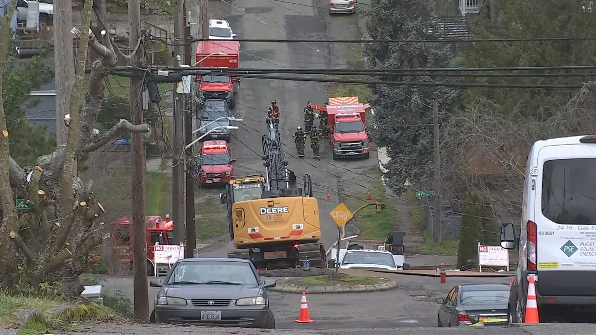 KIRO 7 has been told the 2″ diameter line was cut by a Deere excavator while digging a hole. The closest shut-off valve to the hole was also damaged, and crews will need to move some distance up the gas line to crimp it off.