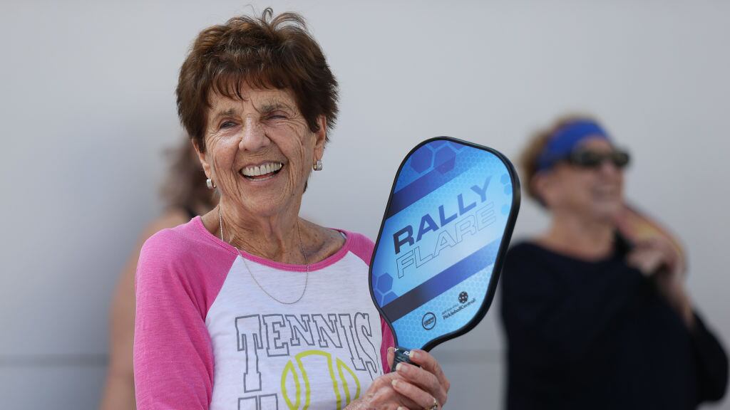 Pickleball is played with a paddle and a plastic ball similar to a whiffle ball. It has elements of tennis, badminton and pingpong.
