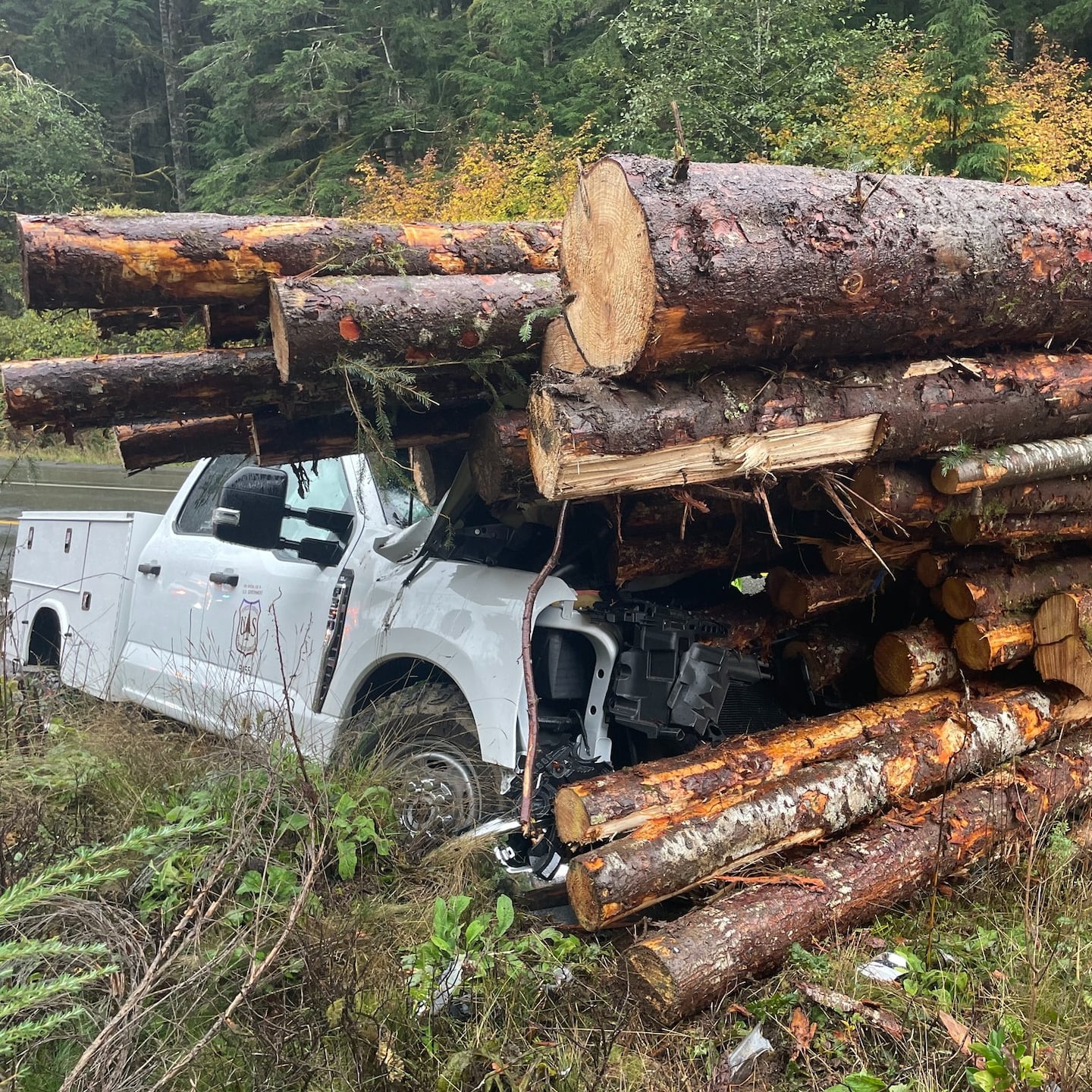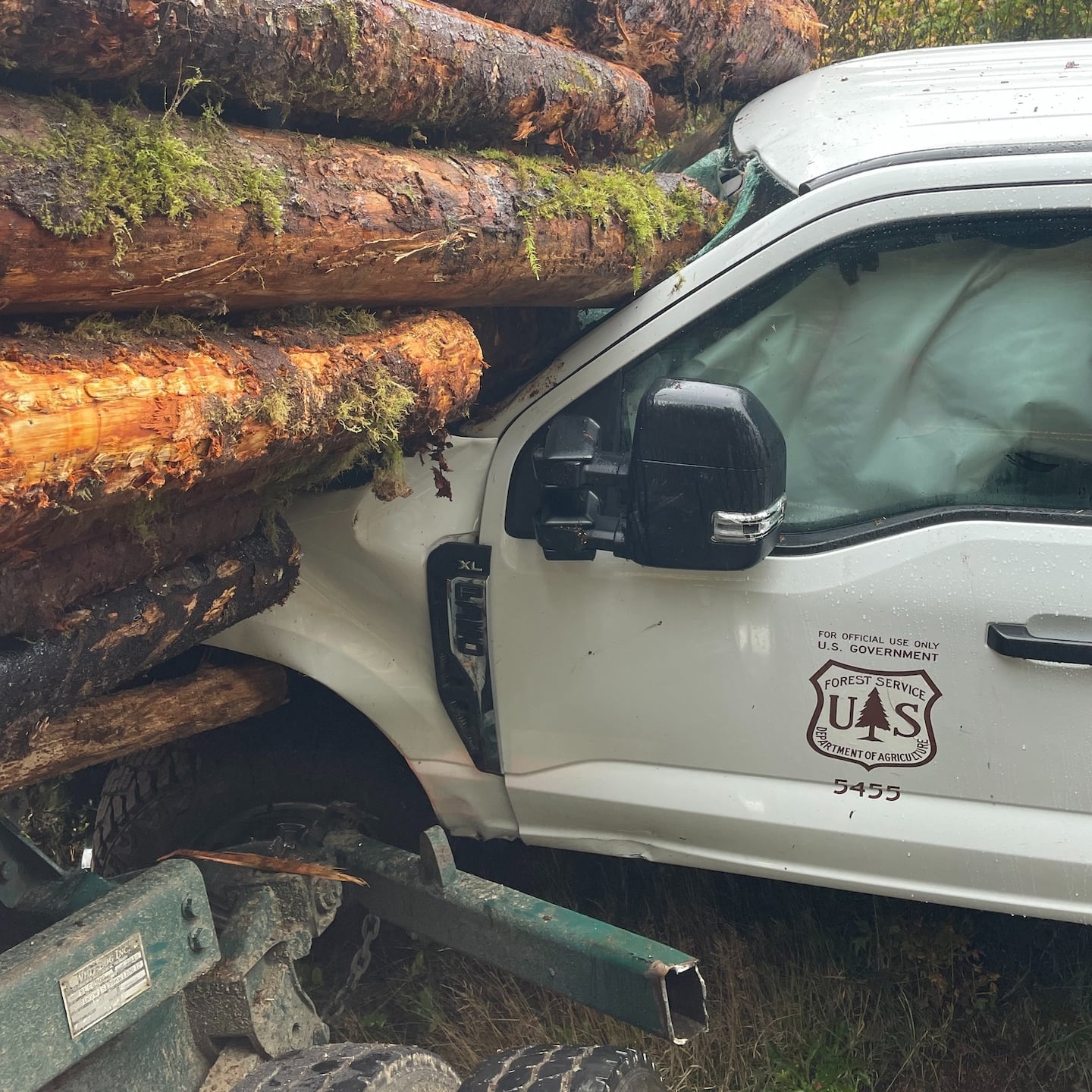 Several logs entered the USFS truck through the windshield, and the driver’s door was crushed.