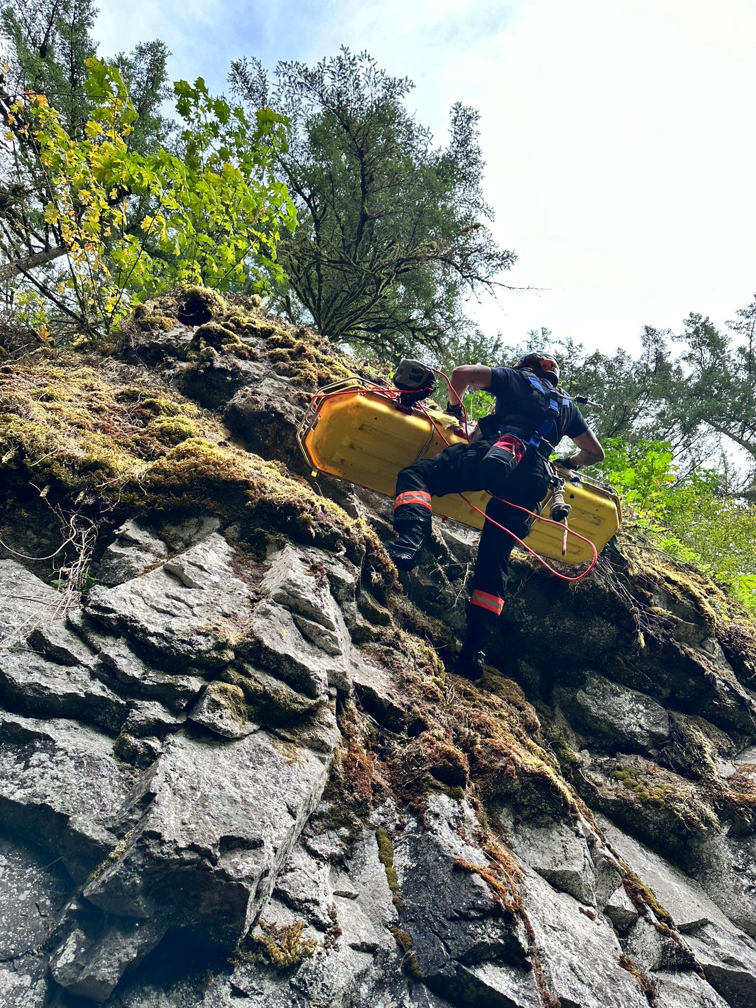 Rescuers report that the patient had hurt their leg after falling approximately 30–40 feet.