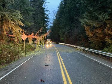 Tree down in Kitsap County A tree fell and knocked over power lines on SR 3 between Airport Way and Lake Flora Road, fully blocking the road. (Washington State Patrol)