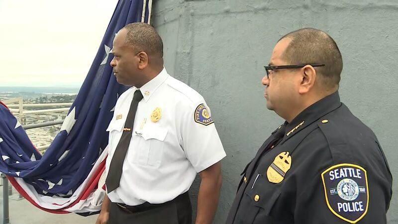 Seattle Fire Chief Harold Scoggins and Seattle Police Chief Adrian Diaz led the flag-raising on Monday morning.