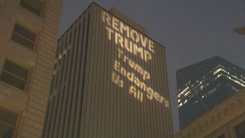 On the morning after the assault on the United States Capitol, a message appeared projected on a building in Downtown Seattle.