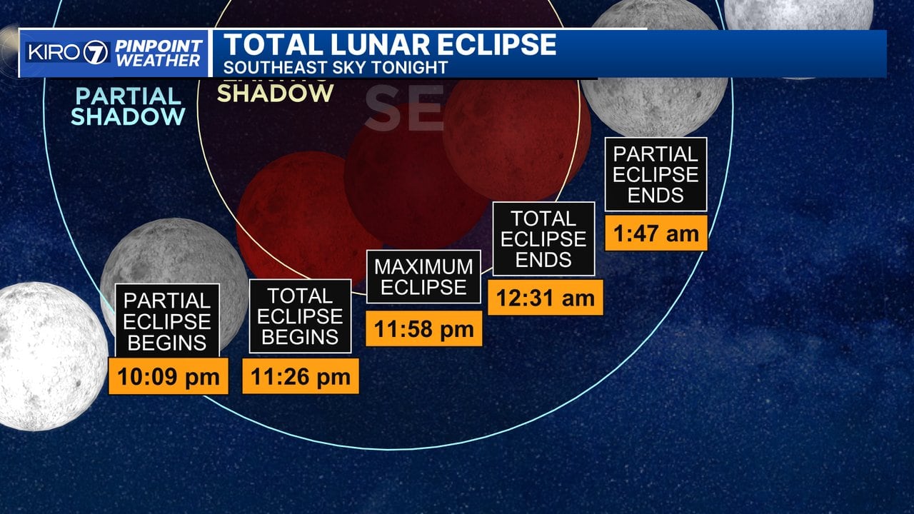 We could get a glimpse of a total lunar eclipse late Thursday night into early Friday morning in Western Washington, though the chances for seeing the “blood red” moon during the period of total eclipse might be blocked by cloud cover.