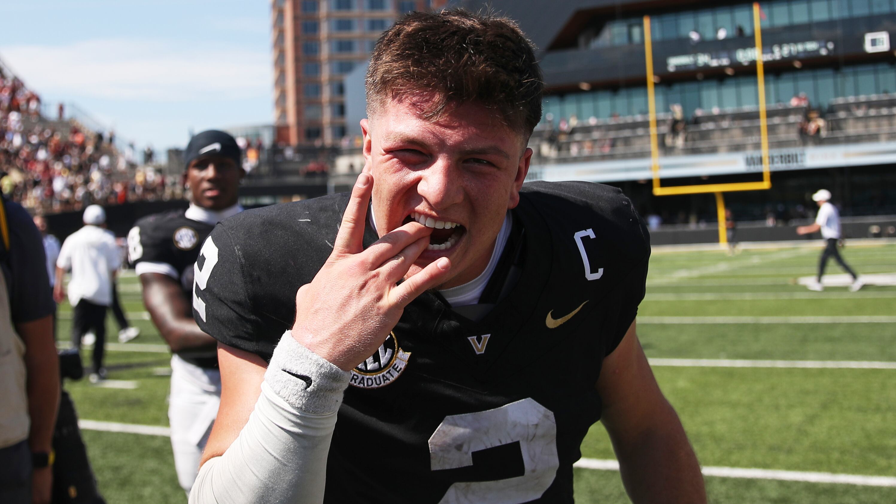 Virginia Tech v Vanderbilt NASHVILLE, TENNESSEE - AUGUST 31: Diego Pavia #2 of the Vanderbilt Commodores celebrates after an overtime victory over Virginia Tech Hokies at FirstBank Stadium on August 31, 2024 in Nashville, Tennessee. (Photo by Johnnie Izquierdo/Getty Images) (Johnnie Izquierdo/Getty Images)