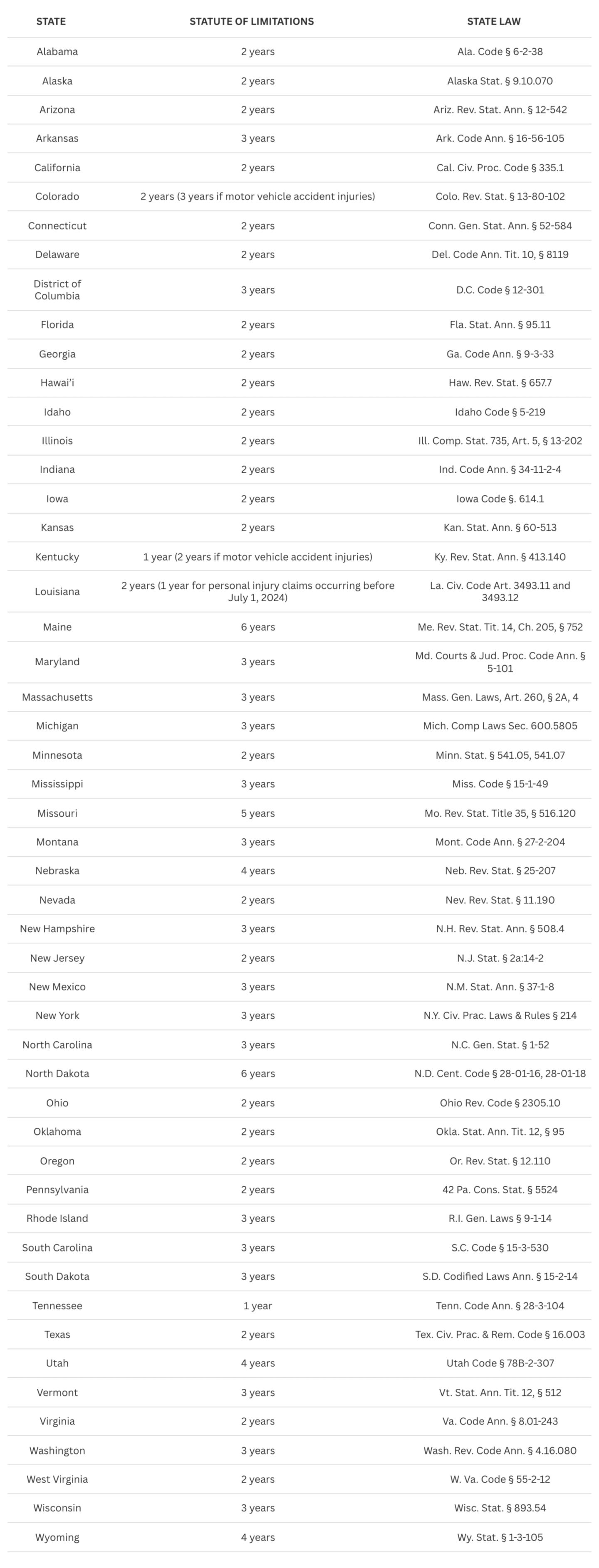 - 5 states use a more complex setup, with limits ranging from 1 to 6 years depending on the injury or who's involved.