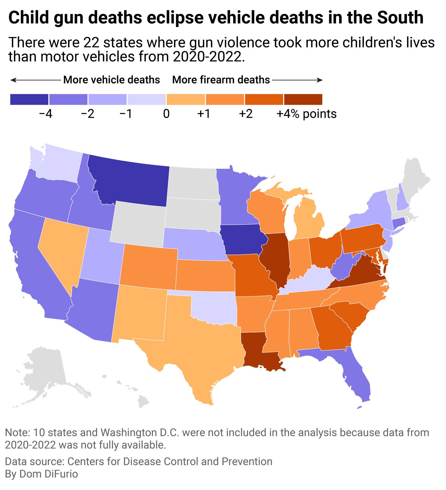 The widest gaps in gun deaths compared to vehicle deaths have emerged in Louisiana, Illinois, Virginia, Maryland, and Pennsylvania. Despite Illinois having some of the most stringent gun laws in the country, kids in that state are killed by guns at among the highest rates in the nation. States where vehicle deaths still outpace deaths related to firearms by the largest margins include Montana, Iowa, Idaho, California, and Oregon.