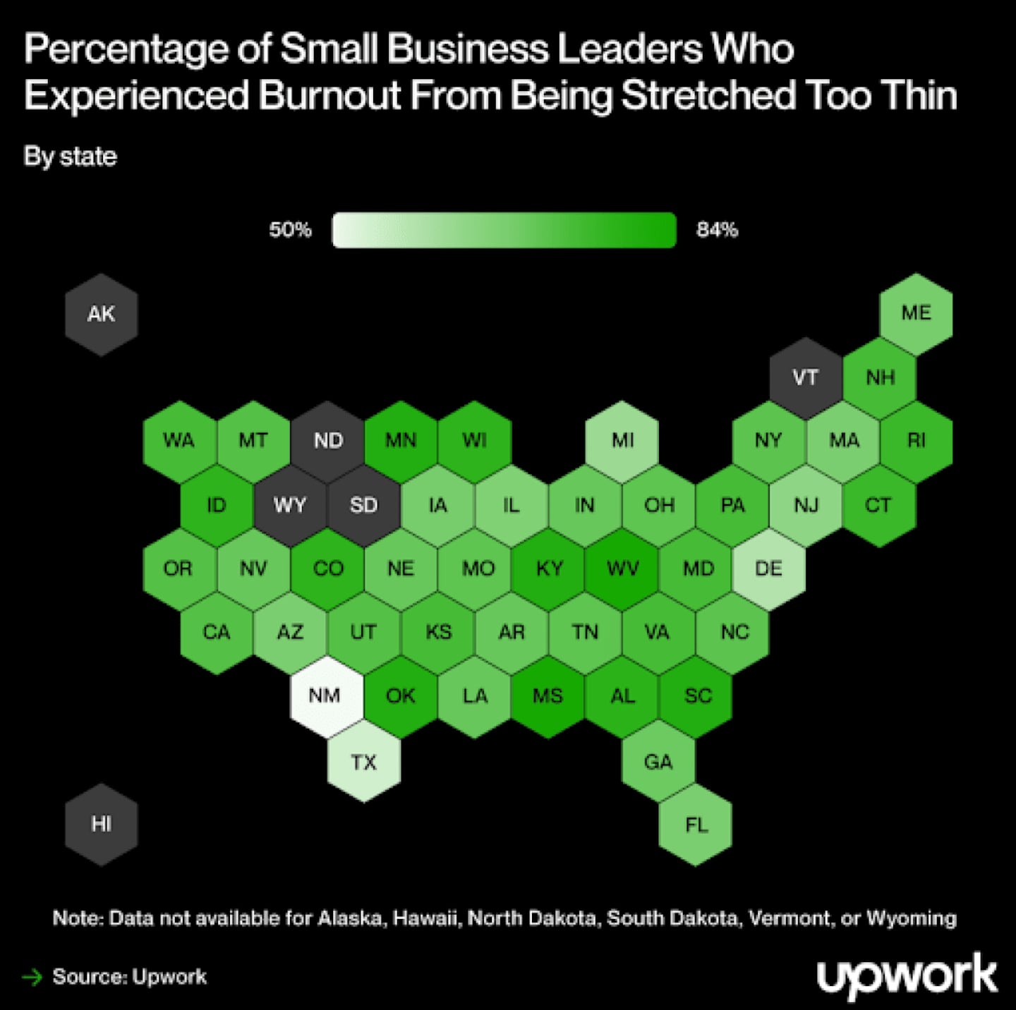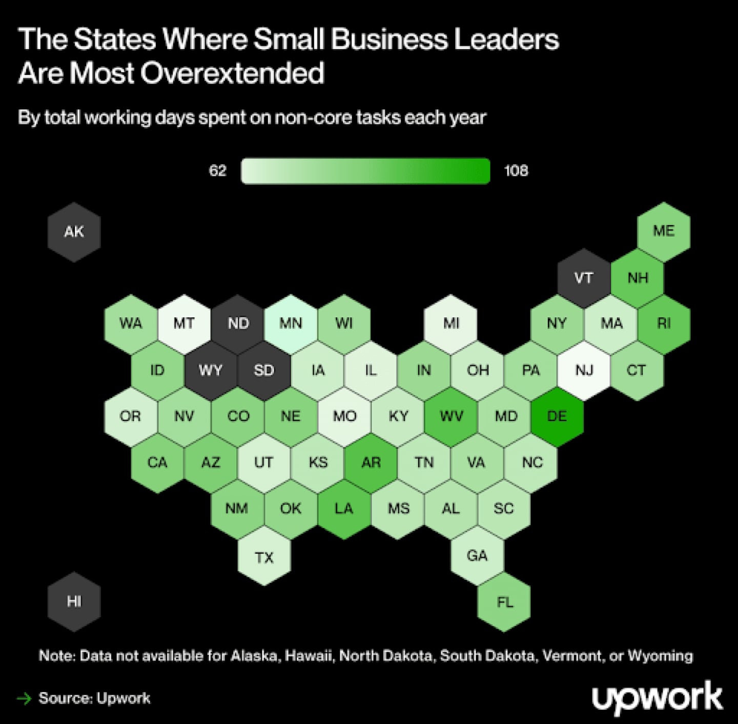 About 72% of SMB leaders in Washington in Upwork's report said that tasks outside their core responsibilities take up time they could be spending on more strategic aspects of the business, and 59% believe that delegating more would help them achieve better results. Fully 80% knew just which tasks they would offload first if they could.
