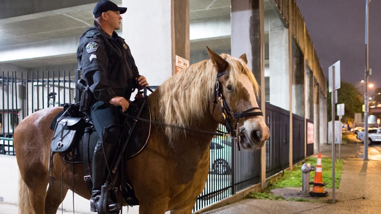 As police were leaving Sixth Street, an officer felt his horse "act and move as if to strike out with both hind legs," and he heard another officer telling him to "watch out for the dog," the affidavit said. The officer looked down and saw Farmer's dog "aggressively trying to bite the hind legs" of the horse, the Austin American-Statesman reported.