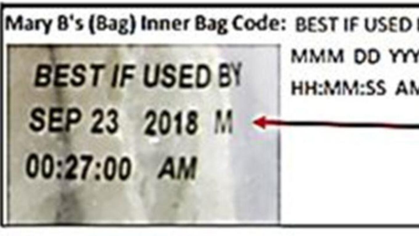 The Mary B's products affected are frozen bagged biscuits. All have "Best If Used By" dates before Sept. 23, 2018, and with the letter "M" immediately after the date.