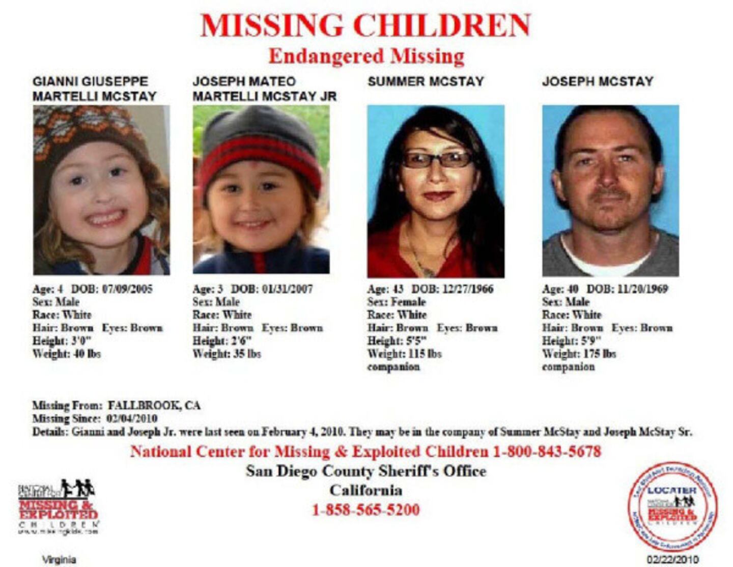 McStay, 40, his wife, Summer McStay, 43, and their two sons, Gianni , 4, and 3-year-old Joseph Jr., vanished Feb. 4, 2010, from their home in the San Diego County community of Fallbrook, uneaten bowls of popcorn on the couch, food left to rot on the kitchen counter and their dogs left in the yard of the home they’d just moved into.