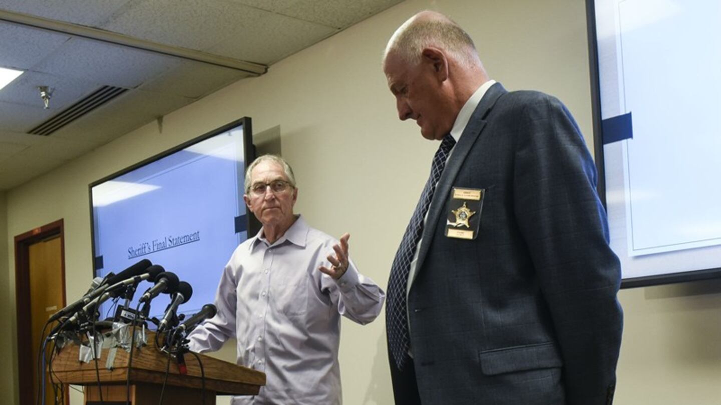 Former FBI agent Al Garber, at podium, disputes statements made by Stearns County (Minnesota) Sheriff Don Gudmundson, at right, during a news conference Thursday, Sept. 20, 2018, on the release of investigative files in the abduction and murder of Jacob Wetterling. Wetterling, 11, of St. Joseph, vanished the evening of Oct. 22, 1989, as he rode home on his bike with his younger brother, Trevor, and his best friend. His disappearance remained unsolved until the fall of 2016, when 53-year-old Danny James Heinrich confessed to killing the missing boy and led police to Jacob’s remains, which were buried on a farm about 30 miles from the site of his abduction.