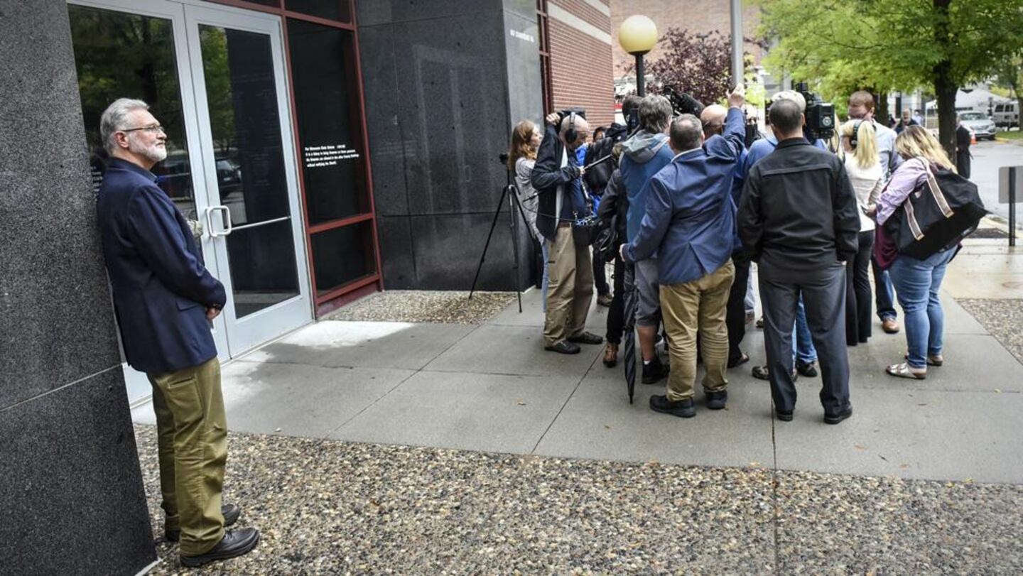 Jerry Wetterling stands alone as reporters circle around former FBI agent Al Garber following a news conference Thursday, Sept. 20, 2018, on the release of investigative files in the abduction and murder of his son, Jacob Wetterling. Jacob Wetterling, 11, of St. Joseph, Minnesota, vanished the evening of Oct. 22, 1989, as he rode home on his bike with his younger brother, Trevor, and his best friend. His disappearance remained unsolved until the fall of 2016, when 53-year-old Danny James Heinrich confessed to killing the missing boy and led police to Jacob’s remains, which were buried on a farm about 30 miles from the site of his abduction.