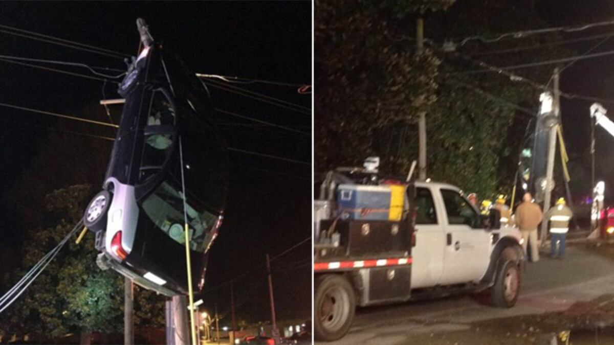 The accident happened just before midnight on Friday. According to The Jackson Sun, the woman's car went off-road, hit a fence and then drove up a guy-wire that connected the pole to the ground. That's when her car continued up the pole and her front tire got caught on a wire, leaving her dangling in the air for two hours until rescue showed up.