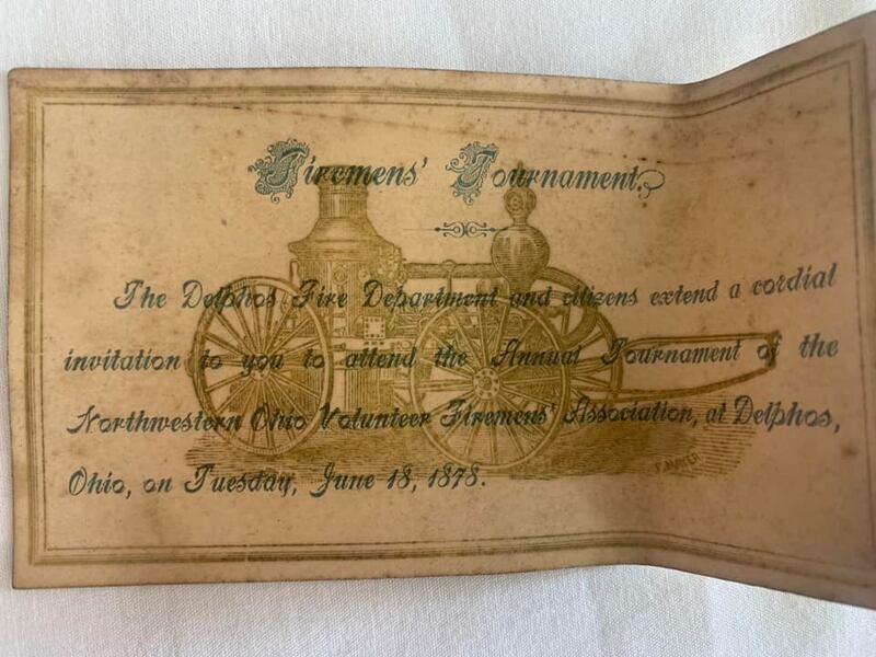 An 1878 invitation from the Delphos Fire Department for the “Northwestern Ohio Volunteer Fireman’s Association Fireman’s Games”;