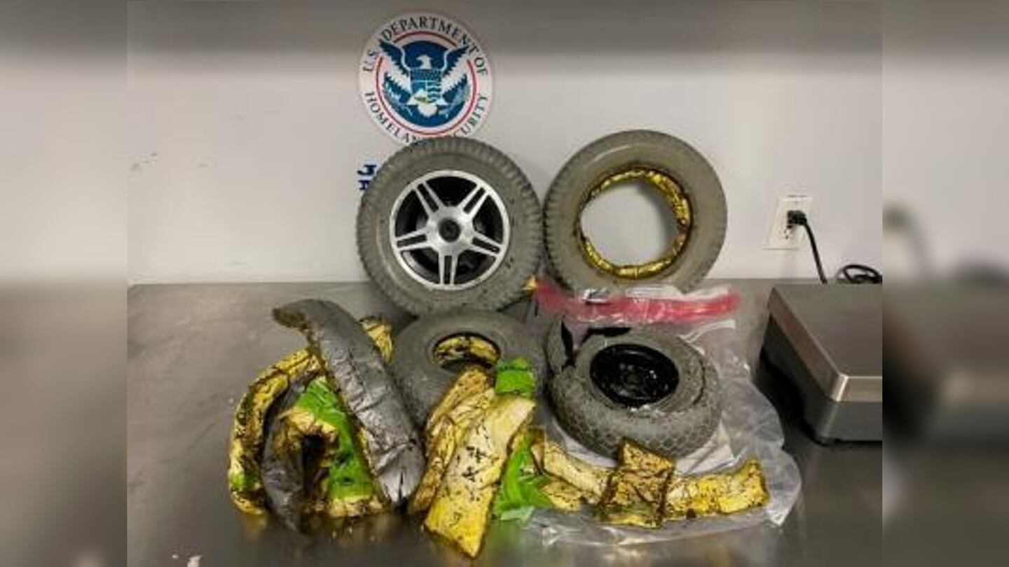 Officers then used an X-ray to examine the wheelchair, and noticed abnormalities in all four wheels. When officers looked closer, they found a white powder inside the wheels that tested positive for cocaine. CBP said the drugs weighed approximately 28 pounds and had a street value of $450,000.