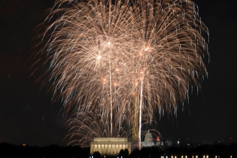 Fourth of July 2021 Fireworks explode over Lincoln Memorial, Washington Monument and U.S. Capitol, at the National Mall, during the Independence Day celebrations, in Washington, on Sunday, July 4, 2021 (AP Photo/Jose Luis Magana) (Jose Luis Magana/AP)