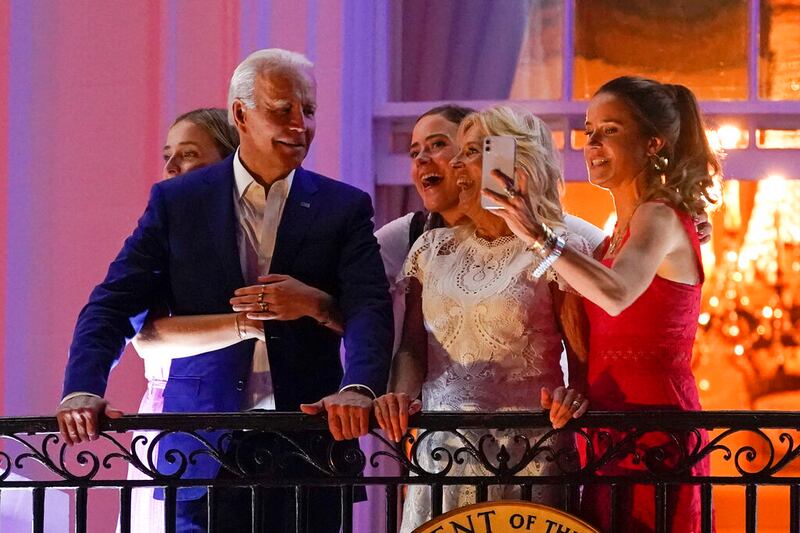Fourth of July 2021 President Joe Biden poses for a photo with granddauther Finnegan Biden, from left, granddaugther Naomi Biden, first lady Jill Biden and daughter Ashley Biden as they view fireworks during an Independence Day celebration on the South Lawn of the White House, Sunday, July 4, 2021, in Washington. (AP Photo/Patrick Semansky) (Patrick Semansky/AP)
