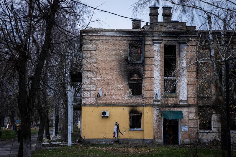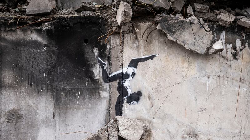 Key Infrastructure Attacked, Leaving Kyiv With Further Power And Water Outages IRPIN, UKRAINE - NOVEMBER 11 Graffiti of a woman in a leotard and a neck brace waving a ribbon is seen on the wall of a destroyed building in Irpin on November 11, 2022 in Kyiv Region, Ukraine. Similar art work in the region sparked online speculation over whether the graffiti artist Banksy has been working in Ukraine. Irpin saw heavy fighting in the first few weeks of the conflict. Electricity and heating outages across Ukraine caused by missile and drone strikes to energy infrastructure have added urgency to preparations for winter. (Photo by Ed Ram/Getty Images) (Ed Ram/Getty Images)