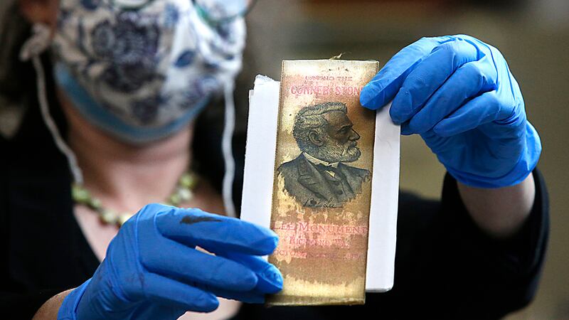 RICHMOND, Va. — Conservators on Tuesday unveiled the contents of a 36-pound copper time capsule found in an alcove at the pedestal of a statue of Robert E. Lee as crews deconstructed the monument in Richmond.