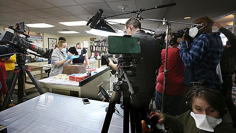 Kate Ridgway, archaeological conservator for the Virginia Department of Historic Resources, cut open the box Tuesday afternoon in front of television cameras. She said it had been found in a pool of water, raising concerns that liquid might have gotten inside, though overall she said it looked like it was “in good condition.”