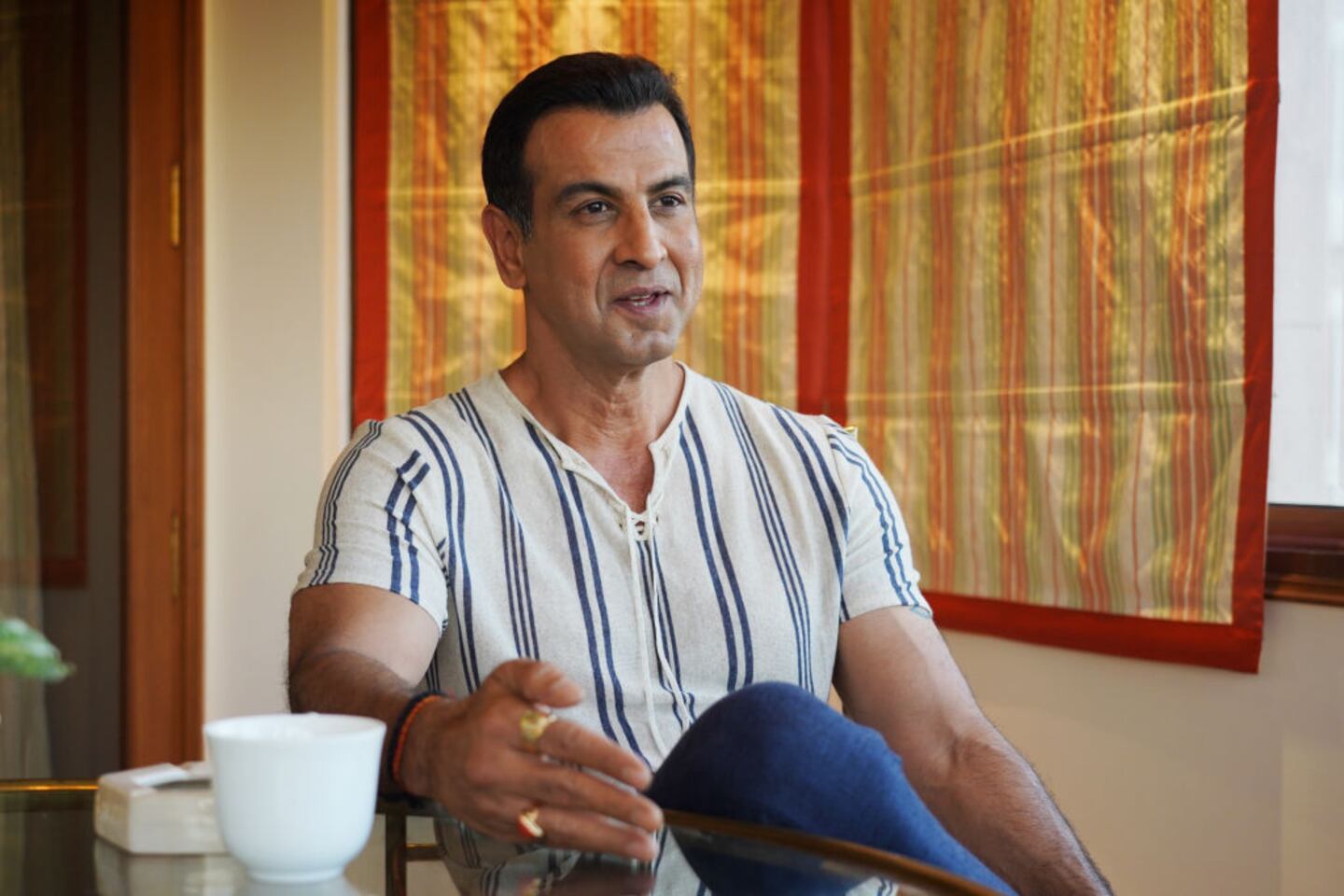 In the video, Bollywood actor Ronit Roy uses a T-shirt to fashion a face covering. Roy puts the T-shirt over his face and twists it in the back, then pulls it over the top of his head. The covering leaves only his eyes exposed.